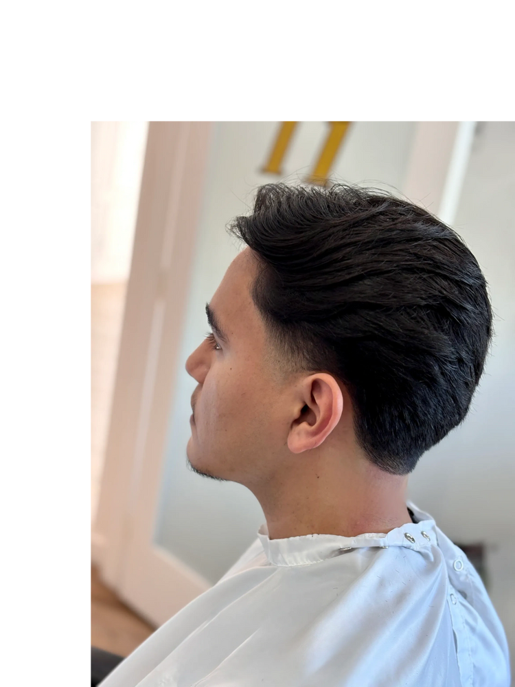 Haircut paired with a clean beard shave, featuring a hot towel treatment and traditional razor blade for a sharp, well-groomed finish.